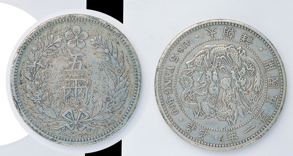 1892년 인천전환국에서 제조된 '오냥은화(五兩銀貨)'는 세계 무역결제용 ‘크라운화’ 규격을 채택한 은화로 설명된다. 한국은행 화폐박물관은 이 은화의 규격·순도 표기(“900”)와 무게 표기(“416 grain”)의 의미까지 함께 안내한다. 또한 초기에 “대조선” 표기가 들어갔다가 외교적 압력 등으로 표기가 바뀐 정황도 표기해, 화폐가 국제관계의 압력을 받는 ‘문서’였음을 보여준다.