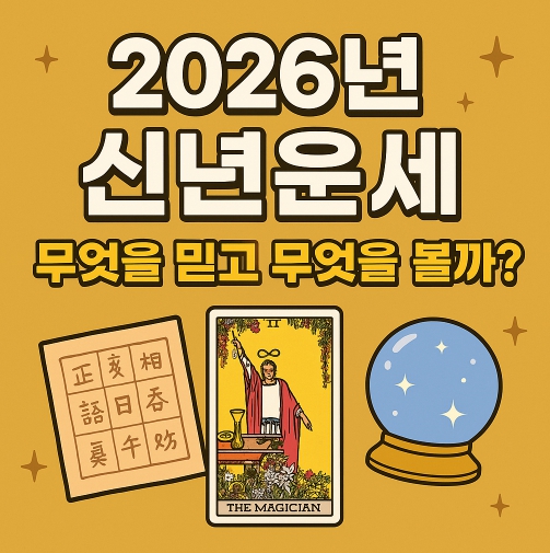 한국에서 인기 있는 운세 콘텐츠의 원리와 재미있는 관점 분석 해마다 12월이 되면 검색량이 갑자기 치솟는 키워드가 있다.바로 신년운세다.2026년을 앞두고도 사람들은 자연스럽게 내년의 흐름, 기회, 변화가 어떻게 올지를 궁금해한다.그런데 우리가 흔히 접하는 운세들은 도대체 어디에서 온 것일까?오늘은 한국에서 가장 대중적인 네 가지 운세 체계를 소개하며,그 근거와 원리, 그리고 각각이 주는 ‘재미 포인트’를 정리해 본다.1. 사주명리학: 태어난 순간의 시간 코드한국에서 가장 오래된 운세 시스템은 단연 사주명리학(四柱命理學)이다.사주는 태어난 연·월·일·시, 총 네 기둥으로 이루어지며, 각 기둥은 천간(天干)과 지지(地支)로 구성된다. 무엇에 기반한 것인가?· 음양오행(陰陽五行): 목·화·토·금·수의 기운 ..